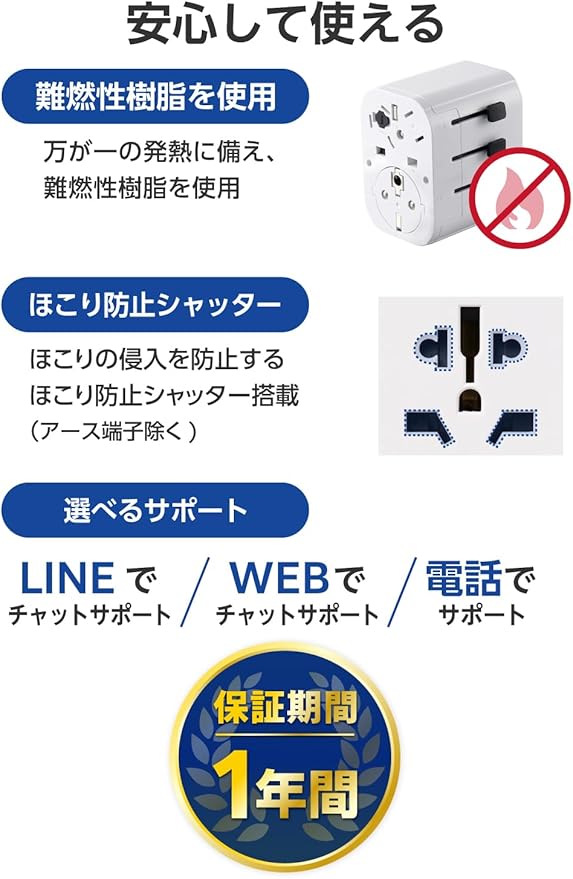 日本のACプラグを海外の形状に変換できる、USB-Aポート搭載マルチ変換アダプターです。