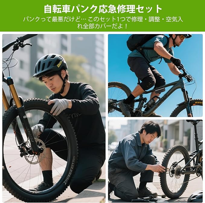 【自転車パンク修理キット23点セット】自転車のトラブルっていつも突然やってくるよね。この工具キットなら、「ゴムのり不要で貼れるタイヤ補修パッチ」に加え、16-in-1 マルチツールや「最大120PSI まで対応」の携帯空気入れまで、計22点がセットに!通勤・通学のバックに入れとけば、自転車乗るときも安心感アップ。