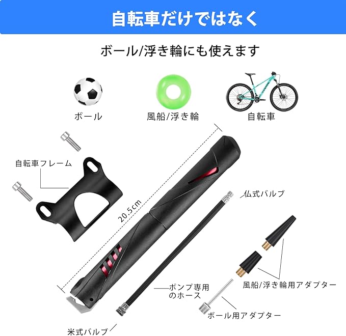 携帯式ミニポンプセット:米式/仏式バルブ対応の携帯式ミニポンプ、、ほとんどの自転車で使用可能!ミニポンプは、最大120PSIの空気圧まで対応でき、手軽に空気を入れることができます。固定用フレーム付き、自転車に携帯空気入れを単独で取り付けることができます。3種類のアダプターも付き、ボール、風船、浮き輪などの幅広い場合で大活躍しています。