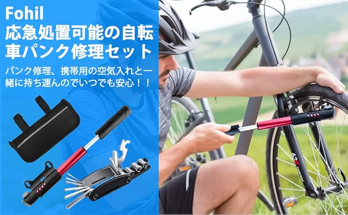Fohil パンク修理キット 自転車 ぱんく修理セット 携帯 自転車工具 16イン1マルチツール 120PSI対応ミニポンプ ロードバイク クロスバイク 米式/仏式バルブ対応 タイヤパッチ 応急修理用 コンパクト メンテナンス 持ち運び便利 説明書付き mtb