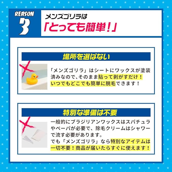 ⭐【メンズゴリラ ワックス脱毛シート】ムダ毛の処理はしたいけど、サロンに行くのはちょっと怖かったりするあなたにオススメのメンズゴリラ・ワックス脱毛シートです。腕や足に濃いムダ毛が大量に生えてるけど、サロンに行かずにまずは気軽に脱毛シートで処理してみませんか?温めて・張って・はがすだけの3ステップで簡単にムダ毛が処理できちゃいます!