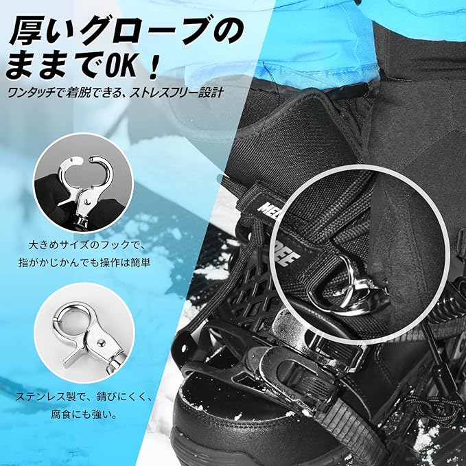 サッと着けてすぐ滑れる: グローブのまま掴みやすいタブで簡単着脱。寒い外でも手間取らず、スタートが速い。