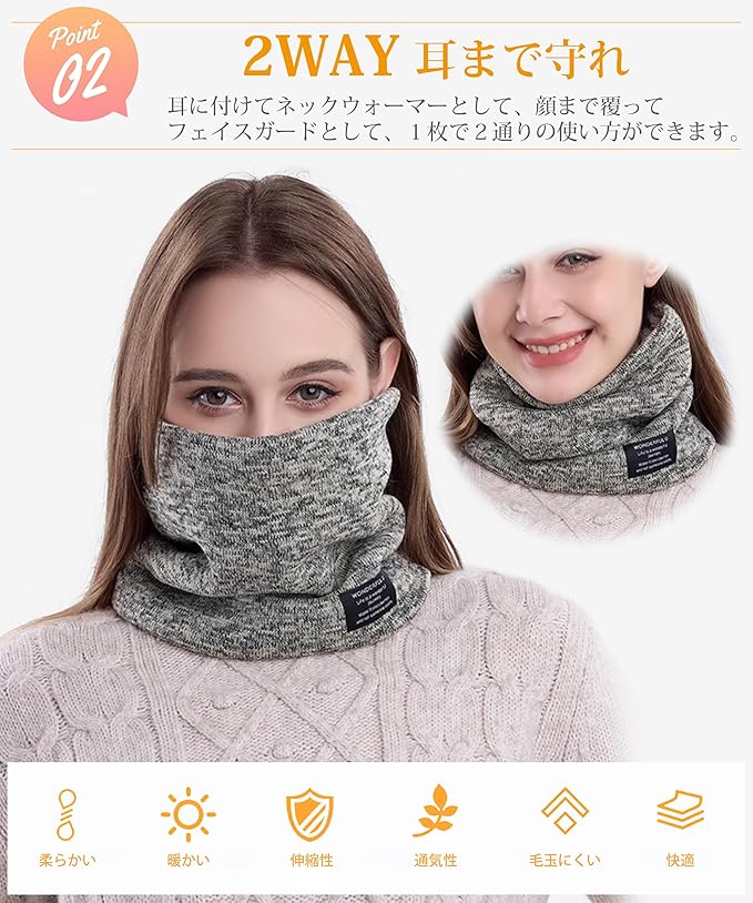 【極めた暖かさ】ネックウォーマーの表地はニット、裏地にはボア素材を使用しているネックガードです。身に着けた時に裏のボアが見えるデザインになっており、おしゃれに保温してくれます。
