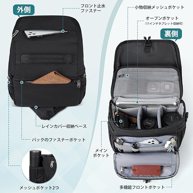 【収納力】大容量のカメラバッグのメインポケットはカメラとレンズ1〜2本が収納でき、ノートPCを収納専用ペースもあります。メイン収納部以外にも、メモリーカードや小物類を収納できる小物ポケット四つがあり、アクセサリー類もすっきり収納できます。ポケット数:メインポケット一つ、内部メッシュポケット一つ、トップポケット一つ、フォントポケット一つ、背面ポケット一つ、サイドポケット一つ。