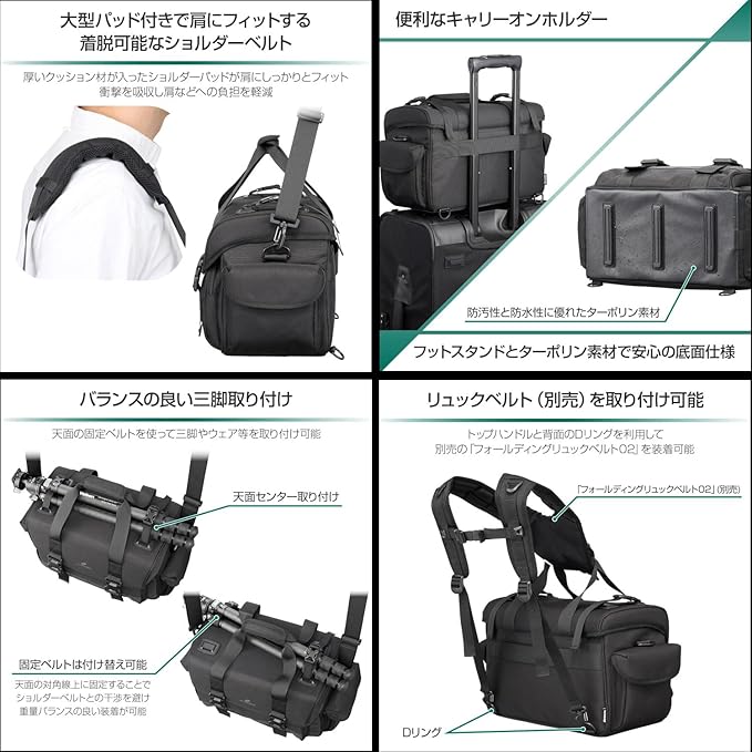 厚いクッション材が入った大型ショルダーパッド、バッグの底が直接地面へ接することを防ぐフットスタンド、背面にはキャリーバッグのハンドルを通せるホルダー、天面三脚ホルダーを装備し、快適な撮影をサポート