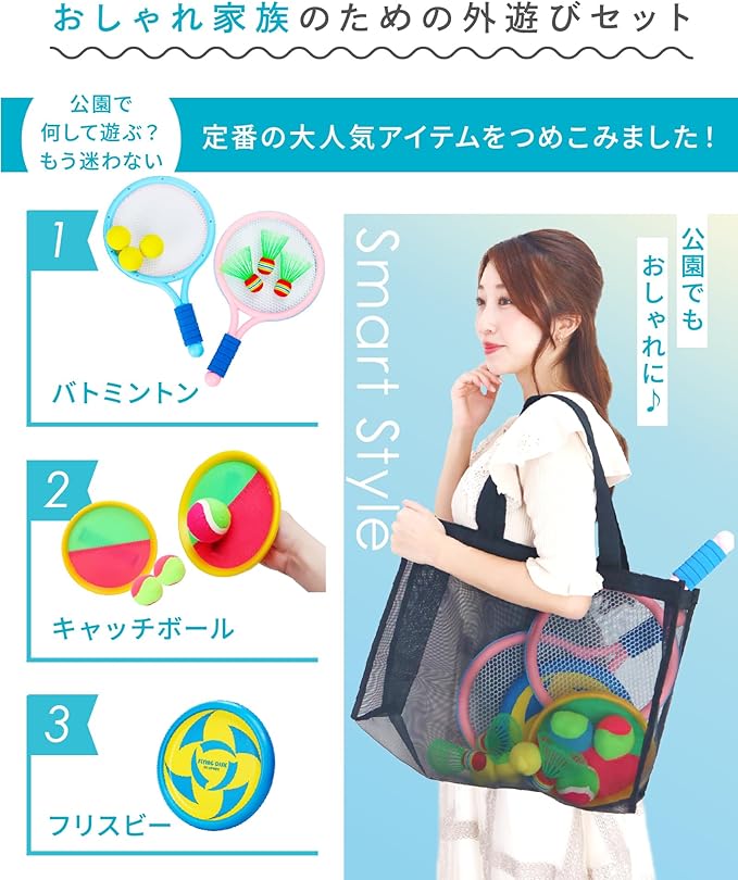商品仕様(豪華14点セット!) ✅ ミニラケット 2本 ・サイズ:縦40cm 横23.5cm ・軽量&太めグリップで小さなお子様でも握りやすい! ✅シャトル羽根 3個 ・サイズ:縦約8cm 横約7cm ・屋外でも飛びやすく、丈夫なつくり。 ✅ソフトボール 3個 ・サイズ:約5cm ・当たっても痛くない柔らか素材。公園遊びに最適! ✅ キャッチボールセット 2個 ・長さ19cm(裏面に調整ベルト付き) ・年齢に合わせてしっかりフィット。親子でも楽しめる! ✅硬球ボール 1個 / 軟球ボール 1個 ・サイズ:約6cm ・硬さの違う2種類のボールで、年齢や好みに合わせて使い分け可能。 ✅フリスビー 1個 サイズ:直径21cm ✅ 収納メッシュバッグ 1個 ・サイズ:縦45cm 横35cm 幅15cm ・雨の日やプールでも使いやすい!通気性&収納力バツグンのマザーズバッグ仕様。