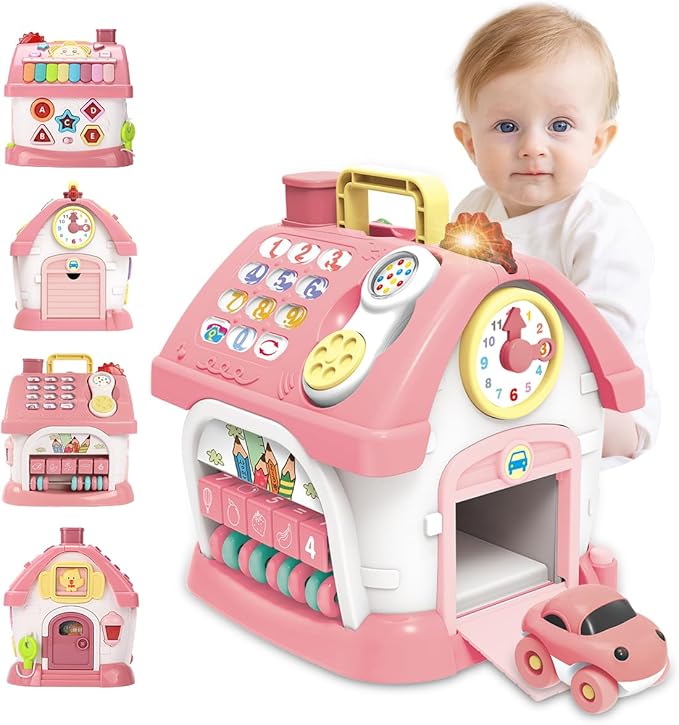 8 in1豊富な遊びの知育玩具:1.電子ピアノ 2.煙突を押すと窓が開く 3.ABCのボタ 4.鍵で開けるドア5.電話のダイヤルと受話器 6.算数あそび 7.時計の針 8.飛び出す車。 八面それぞれに異なる遊び方があり、飽きずに長く遊べます。カラフルなデザインで子どもの興味を引き、指先の発達にも役立ちます。ピンクハウスのデザインもとても可愛く、見た目でも楽しめます。0歳から遊べて、手指の細かい動きのトレーニングにもなります。