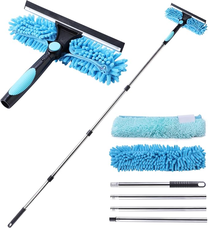 Eyliden 水切りワイパー スクイジー ドライワイパー ガラスワイパー 結露取り 窓ガラス掃除 窓掃除 ワイパー 高所掃除 窓拭き 網戸掃除ローラー 180 回転 約165cm伸縮可能 ブルー 延長ポール付き シェニール&マイクロファイバークロス各1枚 風呂 ガラス 壁 鏡 天井 窓 壁