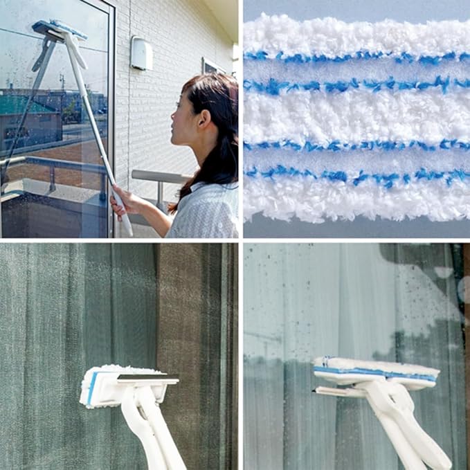 マイクロファイバーとブラシ繊維のWのチカラで窓も網戸もこれ1本でお掃除できます。洗剤不要、水だけでOK。全長約81cmのミドル柄タイプ。 ガラスをキレイに仕上げる水切りゴム付きです。 「安心連結」構造がついた柄が取りつけ可能です。