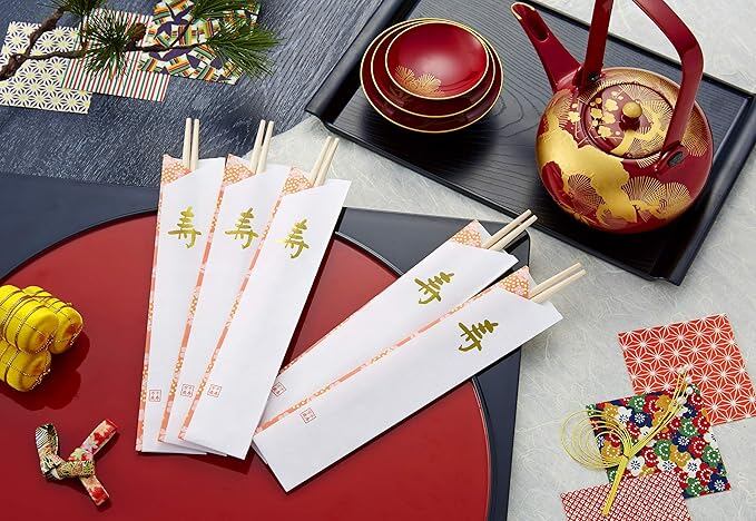 清らかな白木と箸袋の松竹梅柄がハレの日らしい食卓を演出します。
