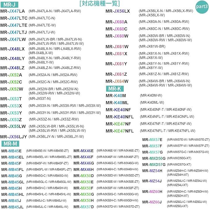 対応冷蔵庫の形名一覧: MR-A41TU、MR-A41TU-W、MR-A41T-UW、MR-A41T-W、MR-A41YW、MR-A41YW-BR、MR-A41YW-W、MR-A41YYRWW、MR-A41YYW、MR-B42T-W、MR-B42T-UW、MR-B42TL-W、MR-B42TL-UW、MR-B42TLU、MR-B42TLU-W、MR-B42TL-W、MR-B42TU、MR-B42TU-W、MR-B42W-F、MR-B42W-S、MR-B42WL-F、MR-B42WL-S、MR-B42X-F、MR-B42X-S、MR-B42XL-F、MR-B42XL-S、MR-B42Y-F、MR-B42YL、MR-B42YL-F、MR-B42YL-S、MR-B46AL-P、MR-B46AL-W、MR-B46A-P、MR-B46A-W、MR-B46ZL-P、MR-B46ZL-P1、MR-B46ZL-W、MR-B46ZL-W1、MR-B46Z-P、MR-B46Z-P1、MR-B46Z-W、MR-B46Z-W1、MR-B46Z-W2、MR-B46Z-P2、MR-B46ZL-W2、MR-B46ZL-P2、MR-BX52W-BR、MR-BX52W-N、MR-BX53X-BR、MR-BX53X-BR1、MR-BX53X-N、MR-BX53X-N1、MR-JX47LA-N、MR-JX47LA-RW、MR-JX47LW-BR、MR-JX47LW-N、MR-JX47LW-RW、MR-JX47LW-W、MR-JX48LX-N、MR-JX48LX-N1、MR-JX48LX-RW、MR-JX48LX-RW1、MR-JX48LX-W、MR-JX48LX-W1、MR-JX48LY-N、MR-JX48LY-N1、MR-JX48LY-RW、MR-JX48LY-RW1、MR-JX48LY-W、MR-JX48LY-W1、MR-JX48LZ-N、MR-JX48LZ-N1、MR-JX48LZ-RW、MR-JX48LZ-RW1、MR-JX52A-N、MR-JX52A-N1、MR-JX52A-RW、MR-JX52A-RW1、MR-JX52W-BR、MR-JX52W-N、MR-JX52W-RW、MR-JX52W-W、MR-JX53T、MR-JX53T-N、MR-JX53X-N、MR-JX53X-N1、MR-JX53X-RW、MR-JX53X-RW1、MR-JX53X-W、MR-JX53X-W1、MR-JX53Y-N、MR-JX53Y-N1、MR-JX53Y-RW、MR-JX53Y-RW1、MR-JX53Y-W、MR-JX53Y-W1、MR-JX53Z-N、MR-JX53Z-N1、MR-JX53Z-RW、MR-JX53Z-RW1、MR-JX53Z-N2、MR-JX53Z-RW2、MR-JX55LW-BR、MR-JX55LW-N、MR-JX55LW-RW、MR-JX55LW-W、MR-JX56LJY、MR-JX56LJY-N、MR-JX56LJY-W、MR-JX56LX-N、MR-JX56LX-RW、MR-JX56LX-W、MR-JX60A-N、MR-JX60A-N1、MR-JX60A-RW、MR-JX60A-RW1、MR-JX60W-BR、MR-JX60W-N、MR-JX60W-R、MR-JX60W-RW、MR-JX60W-W、MR-JX61W、MR-JX61W-BR、MR-JX61X-N、MR-JX61X-RW、MR-JX61X-W、MR-JX61Y-N、MR-JX61Y-N1、MR-JX61Y-RW、MR-JX61Y-RW1、MR-JX61Y-W、MR-JX61Y-W1、MR-JX61Z-N、MR-JX61Z-N1、MR-JX61Z-RW、MR-JX61Z-RW1、MR-JX64W-BR、MR-JX64W-N、MR-JX64W-RW、MR-JX64W-W、MR-R44A-F、MR-R47T、MR-R47T-F、MR-R47T-S、MR-R47W-F、MR-R47W-S、MR-R47X-F、MR-R47X-S、MR-R47Y-F、MR-R47Y-W、MR-R47Z-F、MR-R47Z-F1、MR-R47Z-W、MR-R47Z-W1、MR-R52T-F、MR-R52T-S、MR-R52W-F、MR-R52W-S、MR-RX46A-F、MR-RX46A-W、MR-RX47T-N、MR-RX47T-RW、MR-RX47T-W、MR-RX52T-N、MR-RX52T-RW、MR-RX52T-W、MR-RX57T-N、MR-RX57T-RW、MR-RX57T-W、MR-RX62T-N、MR-RX62T-RW、MR-RX62T-W、MR-WX47A-BR、MR-WX47A-BR1