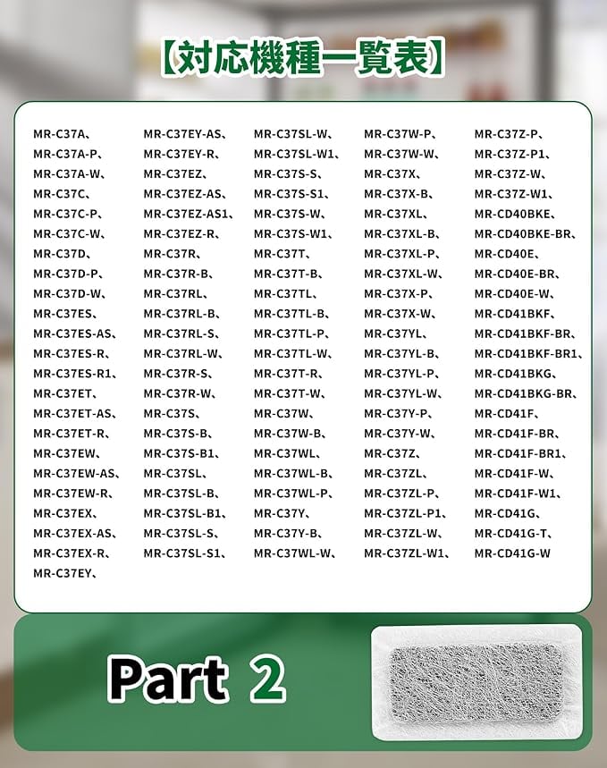 【対応機種】MR-C33F、MR-C33F-W、MR-C33G、MR-C33G-W、MR-C34A、MR-C34A-P、MR-C34A-W、MR-C34C、MR-CL38N-T、MR-CL38N-W、MR-CL38P、MR-CL38PL、MR-CL38PL-S、MR-CL38PL-T、MR-CL38P-S、MR-CL38P-T、MR-CM38N、MR-CM38NF、MR-CM38N-F、MR-TJ38NL、MR-TJ38NL-T、MR-TJ38N-T、MR-TK40R、MR-TK40R-P、MR-TK40R-Sに対応できる三菱用冷蔵庫製氷機フィルターです。(ほとんどの三菱冷蔵庫製氷機に対応できすが、具体的な機種は写真と商品の説明を参考至てください。)