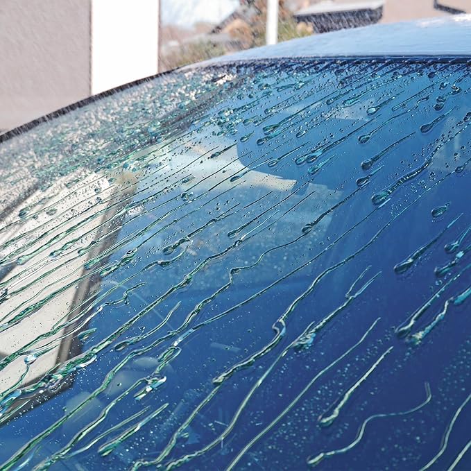 撥水性と滑水性を最大限に発揮する複合撥水成分がガラス面に化学的に結合し、水が滑るように流れ落ちる流撥水コートを形成します。