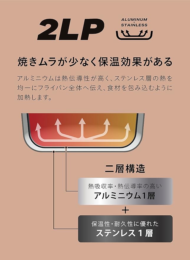 焼きムラが少なく保温効果があるアルミニウムとステンレスの2層構造。アルミニウムは熱伝導性が高く、ステンレス層の熱を均一にフライパン全体へ伝え、食材を包み込むように加熱します。