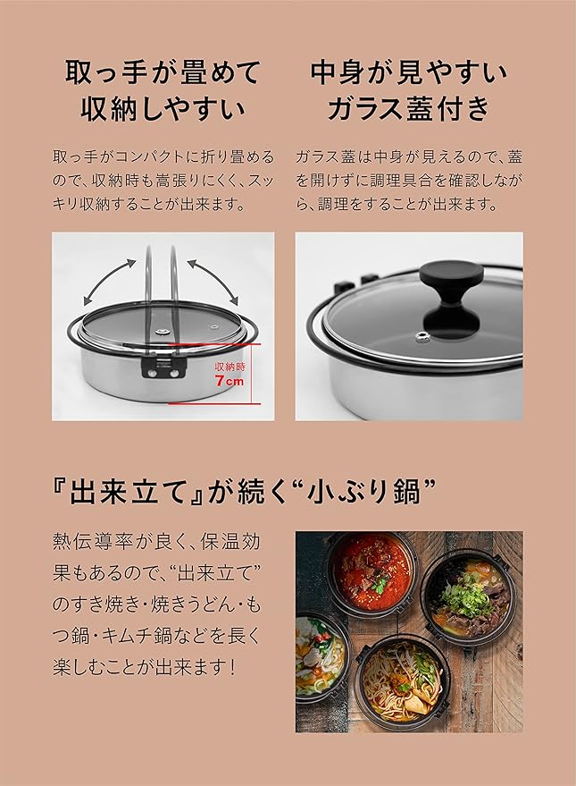 熱伝導率が良く、保温効果もあるので、“出来立て”のすき焼き・焼きうどん・もつ鍋・キムチ鍋などを長く楽しめる小ぶり鍋。
