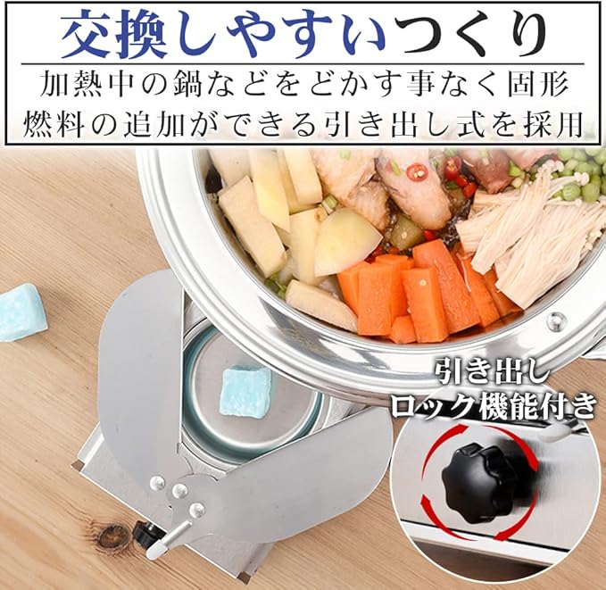 コンロの引き出しのノブを反時計回りに回転させて引き出すだけで固形燃料の交換が行えるので、調理中に鍋を動すことなく交換できます。屋内外問わず使えるため、いつでも美味しい料理をお楽しみ頂けます。※固形燃料は付属しておりません。