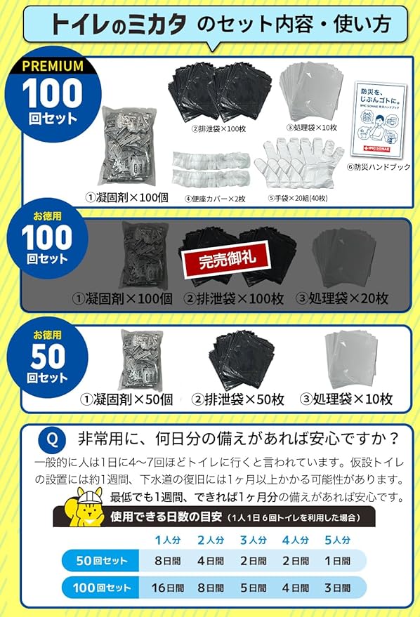【セット内容】 ・凝固剤 7g 50包 ・排泄袋 50枚 ・処理袋 10枚