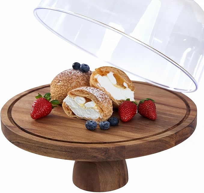 パッケージ内容:12インチ(約30 cm)のリバーシブルアカシアウッドケーキスタンド 1個、壊れにくいアクリルドームカバー 1個