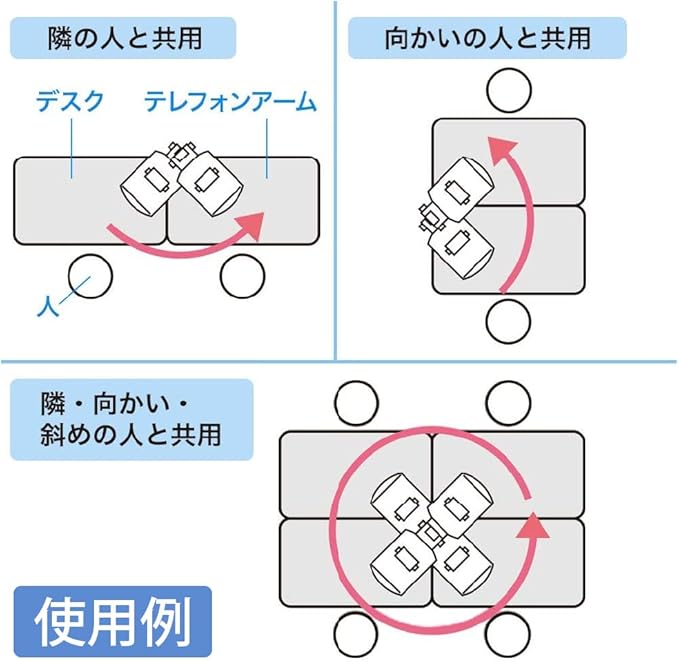 【360 回転で1台を共有】アームが360 回転するので、オフィスで1台の電話を複数人で共有することもできます。4台(または2台)必要なところが1台で使えるので、設置場所も省スペース、電話機費用も節約できてお得です。