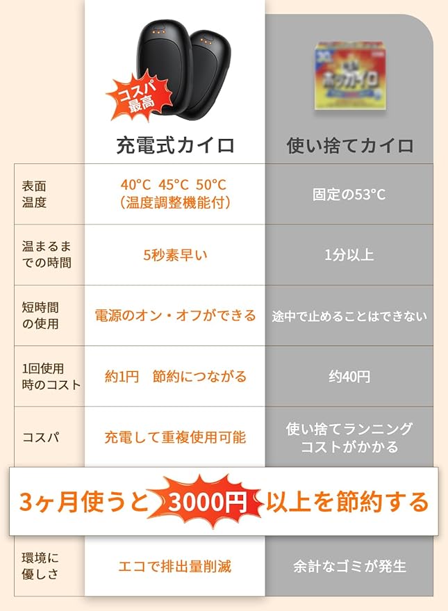 「エコと節約を両立できる」充電式カイロは充電すれば繰り返しの使用でき、余計なゴミがなくて環境に優しいです。それに気になる電気代は1回の充電は約0.96円で、1ヶ月だと三百円未満で、お客様の財布にもやさしい!3ヶ月だと3000円の使い捨てカイロより、驚くほど省エネで経済的です!従来のカイロに代えて充電式を選択する人が増えています。