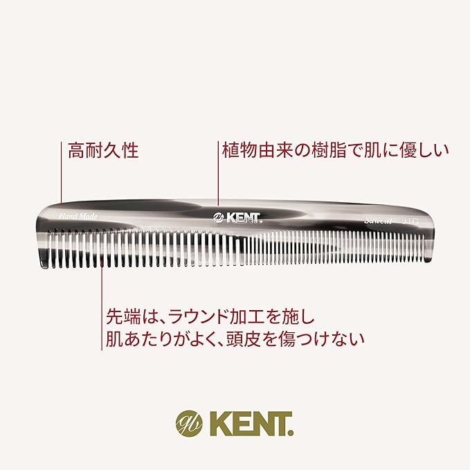 GB KENT (ケントブラシ)のハンドメイドヘアコームは綿花由来の樹脂を使用し、肌と髪に優しく安全です。