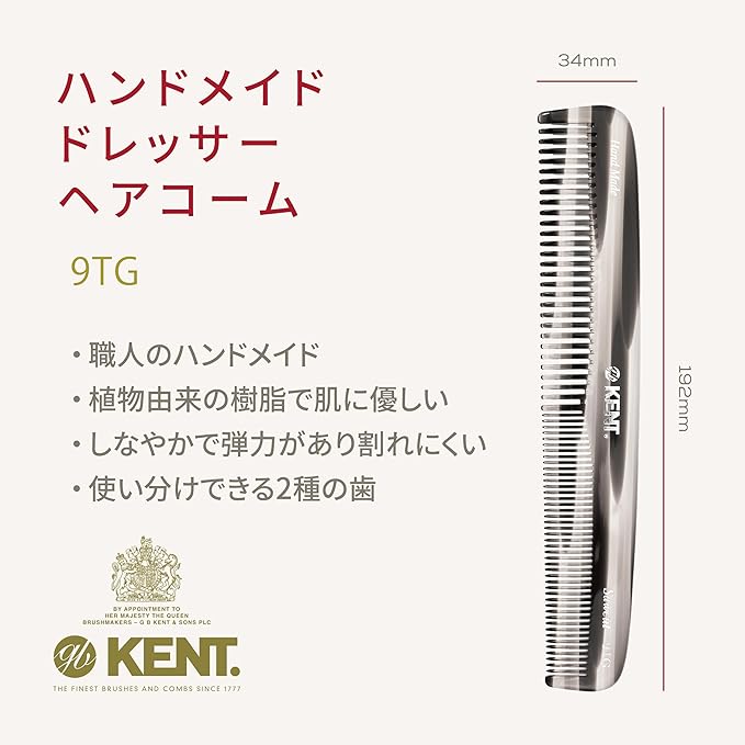 GB KENT ケント 英国王室御用達 高級 ハンドメイドヘアコーム 190mmドレッサーコーム くし 櫛 天然由来 静電気抑制 サラサラ 細かい歯 粗い歯 2Way 両歯タイプ 9TG (グレー)
