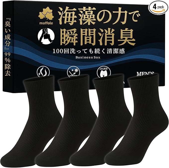 [maffole] 靴下 メンズ 海藻繊維 抗菌防臭 ビジネスソックス スポーツ 蒸れない 綿 くるぶし 通気性 24-27cm クルー丈 黒 薄手 4足