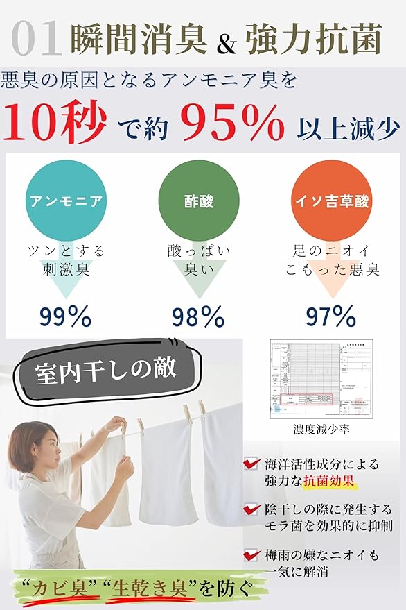 【公的機関実証済】悪臭の原因となるアンモニア臭が10秒で約95%以上減少。繰り返しの洗濯後の効果も実証済み。