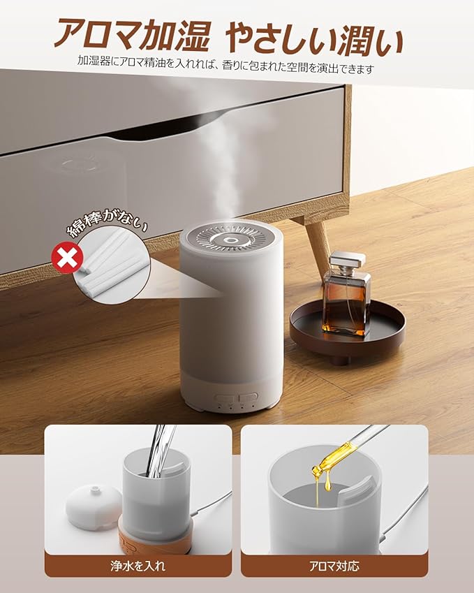 【アロマ対応・上部給水】上部から直接給水できる設計なので、蓋を開けるだけで簡単に注水。給水タンクは取り外しも可能で、手軽に補水作業ができます。アロマオイルに対応しているため、お気に入りの香りを加えるだけで、潤いとリラックス効果を同時に楽しめます。超音波霧化技術により、微細で均一なミストを発生。肌に優しく、家具を濡らすことなく室内全体をムラなく保湿。乾燥から肌と髪を守り、しっとりとした快適空間を長時間維持できます。
