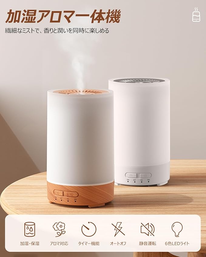 【2025新登場・タイマー機能搭載】加湿器 卓上 小型 アロマ対応 超音波加湿器 アロマディフューザー 2段階ミスト 7色LEDライト 自動停止機能 35dB 静音設計 省エネ 2種類ムードライト USB給電式 16時間連続稼働 睡眠モード 長時間運転 空焚き防止 上から給水 お手入れ簡単 車載 軽量 持ち運び便利 乾燥/花粉症対策 寝室・家庭・車用/デスク・リビング・オフィス用 綿棒なし