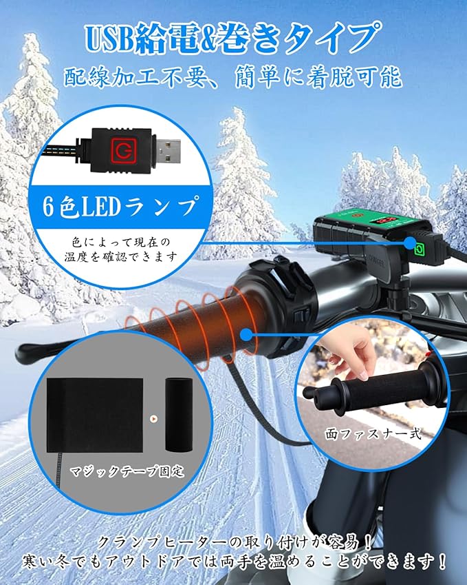 【改良型 5+1段階温度調整】バイク グリップヒーター 巻き付け式 ハンドルヒーター バイク用 USB給電 10s速暖 IP67完全防水 温度制御チップ搭載 ホットグリップ 巻きタイプ 取り付け簡単 記憶機能 電熱 ウォーマー オートバイ/自転車/原付/スクーター 各種ハンドルに適用 防寒対策 日本語取扱説明書(車両12V電源)