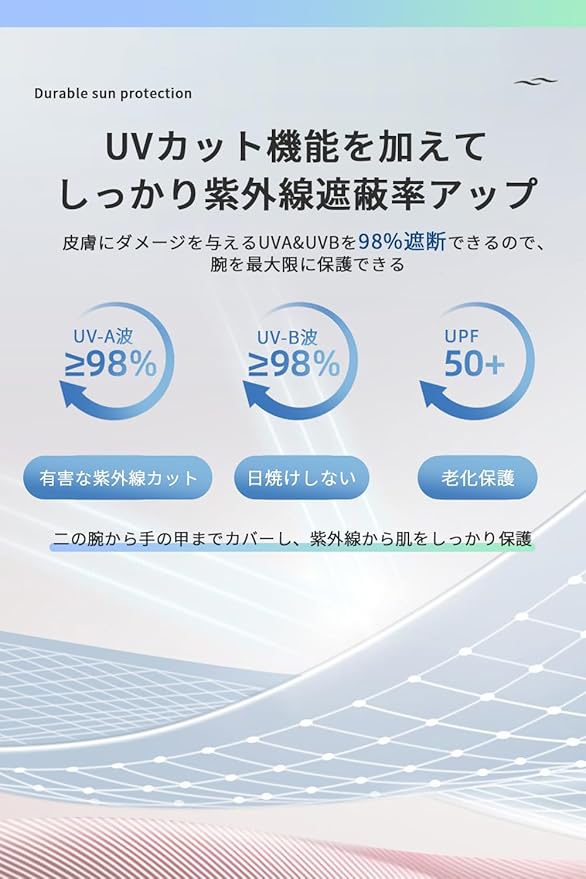 【スキンケアアドバイザーから紫外線対策のおすすめ】一度使えば、実感できる業界最高水準のUPF50+、紫外線カット98%以上。付けるだけで、手の甲から二の腕部分までしっかりUVカットします。付けるだけで、暑い夏の時期の紫外線(A波、B波)を強力に吸収することで肌を守ります。日焼け止め効果抜群、春、夏、秋に欠かせない理想的なアームカバー UVカットです。