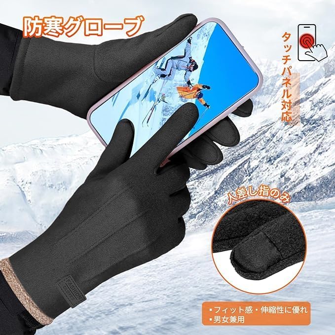 【スマホ操作はそのまま! 素早い反応がうれしい高感度タッチパネル対応】 寒空の下、いちいち手袋を脱ぐ必要はありません。人差し指に採用した高感度導電糸が、スマートフォンのタッチ操作を確実に伝えます。メッセージの送信、写真撮影、地図アプリの操作などが手袋着用のままストレスなく行え、室外での作業や待ち時間を快適にします。
