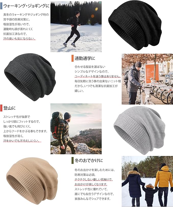 【お手入れや推薦使用場所】中性洗剤でお手洗いや洗濯機両方OKです。漂白剤や蛍光剤など入れないでください。他の洗濯物と絡まないよう洗濯機洗いの時ネットに入れて洗濯してください。平置きで干してください。性別と年齢は限らず、薄毛隠し、白髪隠し、スキンヘッド、坊主頭、外出用、室内帽子、就寝用、仕事、ウォーキング、旅行、釣り、野外活動など 普段の通勤や通学の防寒アイテムとしてはもちろん、バイク、自転車、スノボ、冬のウィンタースポーツでも大活躍のニットキャッ。