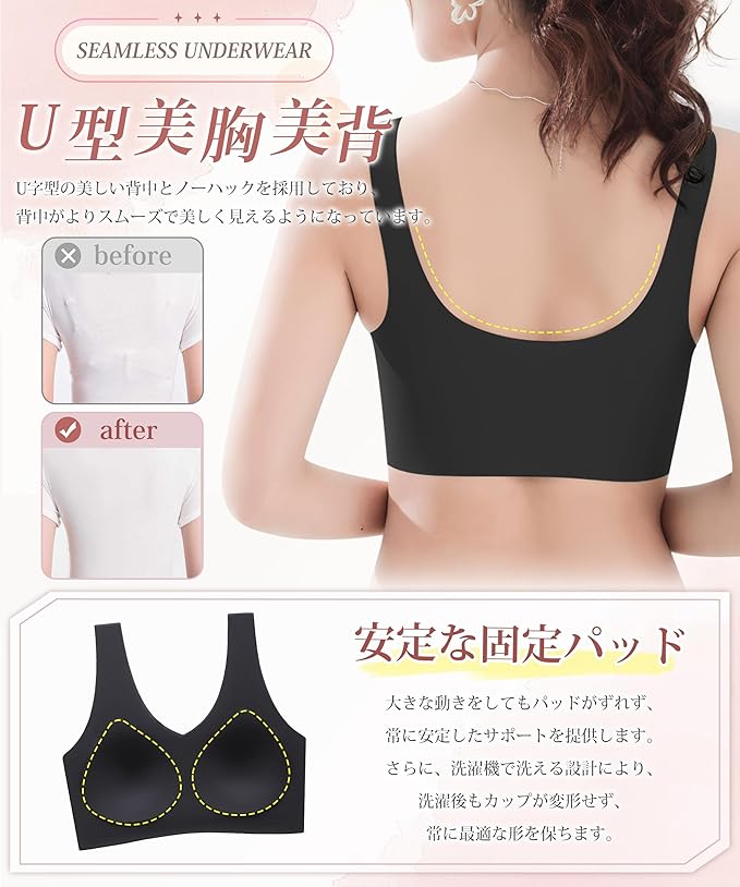 ㊙️【ずれにくい・安定な固定パッド】「洗った後ブラのパッドがずれ」などの悩みを見て、新たにパッドを固定するノンワイヤーブラを開発しました。大きな動きをしてもパッドがずれず、常に安定したサポートを提供します。さらに、洗濯機で洗える設計により、洗濯後もカップが変形せず、常に最適な形を保ちます。軽量かつ薄手のパッドがしっかりと胸を包み込み、安心感をもたらします。ノンワイヤーブラですが、ワイヤーがなくてもバストをしっかり支え、美しい胸のラインを作り上げます。