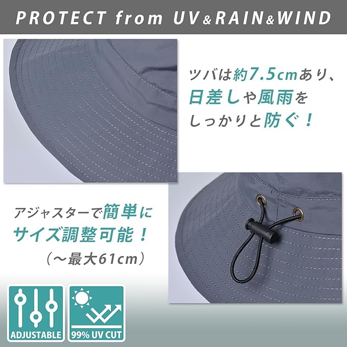 【サイズ・仕様】頭周りのサイズはアジャスターで調整可能(~最大約61cm程度)。ツバは約7.5cm、あご紐は最長約37cmで重さは約70グラムと超軽量。折りたたむと直径約16cmで薄さ約2cmに収まります。肌触りのよさと高い防水性を実現した高品質なナイロン製です。