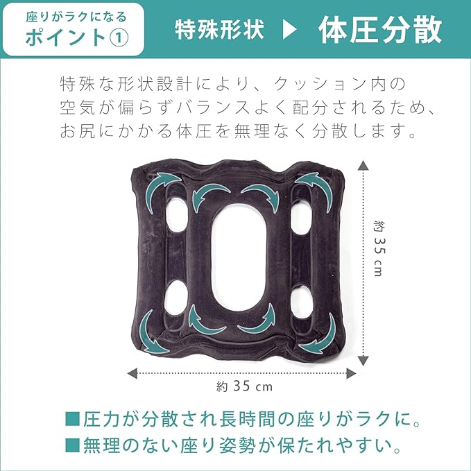 【 長時間の座りも快適!体圧分散エアクッション「AirFIT-350(エアフィット350)」】 空気が体圧を分散し、座り心地を快適にするエアクッションです。デスクワーク・ドライブ・旅行・オフィスなど、長時間座る場面でも活用可能!空気注入の調節で、好みの柔らかさ&厚さに変更可能。長時間座る方やデスクワークが多い方にもおすすめです。