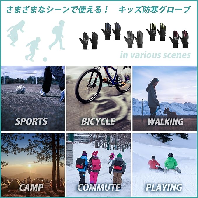 【幅広い用途に使える!】高い防寒性&保温性がありながら肌触りが良くて脱着しやすく、指先まで動かしやすくて撥水加工も施されているので、使い勝手がよく、幅広いシーンで気軽に使えます。ちょっとしたお出かけや通学などの普段使いはもちろん、自転車、サッカー、ハイキング、雪遊びなどの際にも◎。子供たちへのプレゼントにもオススメです。