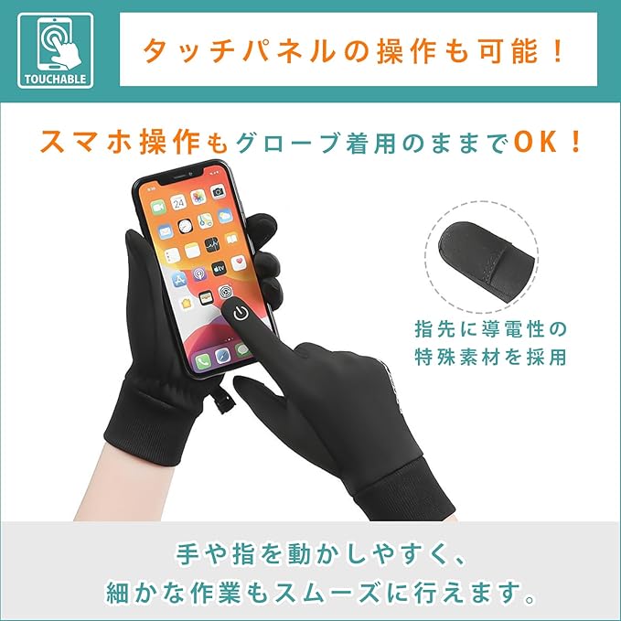 【指先まで動かしやすく、タッチパネルにも対応!】ストレッチ性のある素材を、手のカーブに合わせて立体裁断しているので、手や指を動かしやすく、細かな作業もスムーズに行えます。親指と人差し指の先に導電性繊維の特殊素材を採用することでタッチパネルにも対応! グローブを着用したまま スマートフォンやタブレットPC等の操作も可能です。