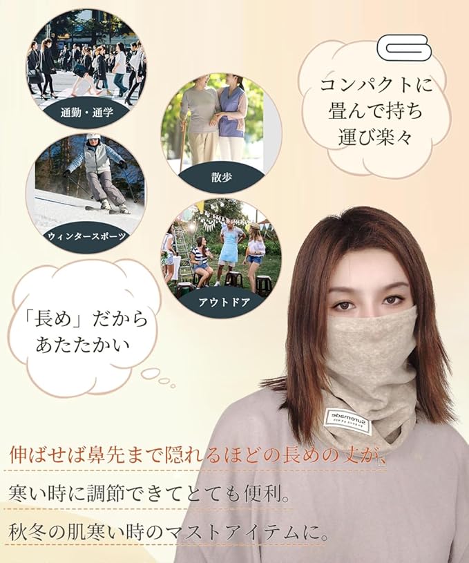 【軽量で伸縮性優れる】伸縮性に優れた素材を使用して、締め付け感がなく、程よいフィット感で圧迫感がなく快適な付け心地です。束縛がなくて、顔を締めつけません。また軽いので、首、肩に負担をかからず、どこに行っても持ち運びやすいアイテムです。通勤、通学、ちょっとお出かけにも、急な寒さを感じた時の防寒対策にもぴったりです。