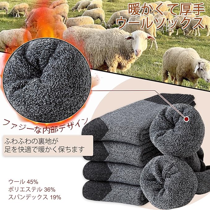 【快適なウールソックス】靴下 メンズ ションウールソックスは、ウール45%、ポリエステル36%、スパンデックス19%の混紡です。プレミアムな高品質ウールソックスなので、とても柔らかく、厚手ですが通気性があり、心地よく、ふわふわの裏地で足を快適で暖かく保ちます。