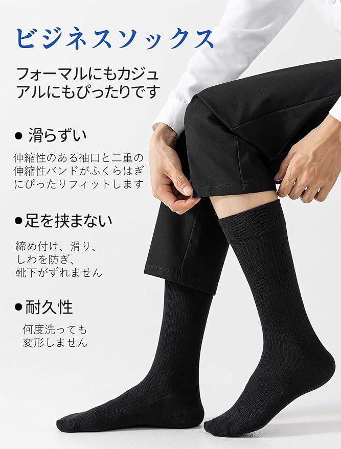 【機能的なデザイン】ビジネスソックスつま先とかかと部分のストレスポイントを二重縫いすることで、毎日の着用に耐えます。クラシックなハニカムストレッチカフと二重層のゴムバンドは、ふくらはぎにぴったりフィットし、締め付け感、ずれ、しわを寄せ付けず、しっかりと固定します。