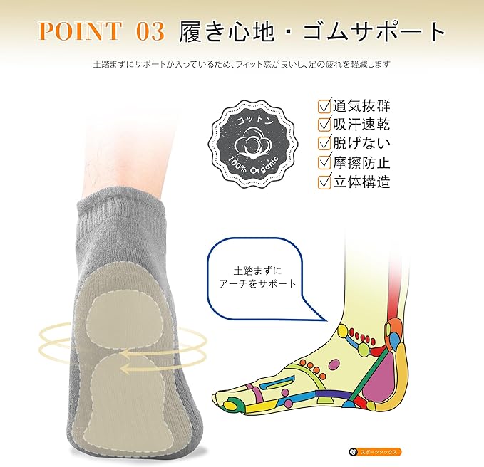【抜群の柔らかさ】高質な天然綿とポリエステル素材で肌にやさしく、通気メッシュ編みで足元の清潔を保ち、ニオイをふせぎます。繊維に弾力性がありますので、洗っても柔らかさが持続し、吸水性のよい仕上がりで最高なフィート感を保証できます。