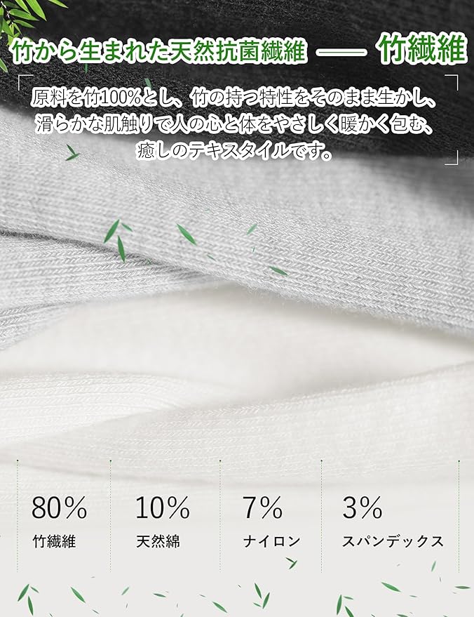 【天然抗菌防臭機能】昔から、竹や笹は、すぐれた抗菌力が重用され、おにぎりを包むなど、食べ物の保存に使用されてきた。天然抗菌竹繊維は、独自の製法により優れた竹の天然の抗菌力をそのまま生かした。雑菌が繁殖しにくいため、有効的に気になる足の異臭を抑えられます。一日中長時間の着用でも臭くなりにくくなります。肌に直接触れる織り物によく利用されている。