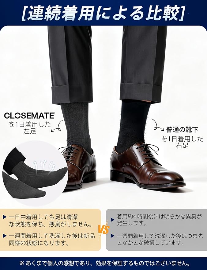 [CLOSEMATE]ビジネスソックスは、レザーシューズとの搭配を専門に考慮して設計され、実用的な機能性とスマートな外観を両立しています。長さは非常に適切で、過長にも過短にもなく、ビジネスシーンでソックスが露出したり長さが不適切な場面になったりすることを防ぎ、常に得体の良い印象を保たせます。サイズは29丈cmで、大多数の成人の足型に対応しますが、個人の足型に差があるため、着用感に違いが生じる場合があります。購入前に足の長さを測定し、フィット感を確認することをおすすめします。通気性と防臭性に優れたパフォーマンスを発揮し、高い吸汗透気性を持つ素材が湿気を速やかに排出し、足の蒸れやべたつきを防ぎます。専門的な防臭加工も施されているため、細菌の繁殖を効果的に抑制し、長時間着用しても足を清潔に保ち悪臭を防ぎます。独特の編み込み構造により、空気の流通性がさらに向上し、快適さを高めます。 素材には高品質なコーマ綿を使用し、触感が柔らかく滑らかで、肌に優しく刺激が少ないです。同じ素材はカフーソックスの款式にも採用されており、足首に接触する部分も柔らかく、締め付け感を感じにくいです。コーマ綿の高い吸水性により、足から出た汗を速やかに吸収して乾燥を保ち、長時間着用しても疲労感が少なく、繰り返し洗濯しても柔らかさとビジネスソックスとしての耐久性を維持できます。 特殊な精密編み込み技術を採用し、日常的に摩耗しやすい爪先とかかとの部分を二重に強化処理し、破れや糸のほつれを大幅に減らします。同時にエルゴノミクスに基づいた立体裁断を採用し、足の曲線に密着します。通勤での歩行や出張での移動など、長時間着用してもズレたり捲れたりすることがなく、安定した快適さを保ちます。全体は黒とグレーデザインで、シンプルかつ大方なスタイルで、搭配に時間をかける必要がありません。スーツを着て正式な会議に出席する場合でも、カジュアルパンツと搭配して日常に着用する場合でも、自然に造型に溶け込み、様々なシーンのニーズに応えることができます。