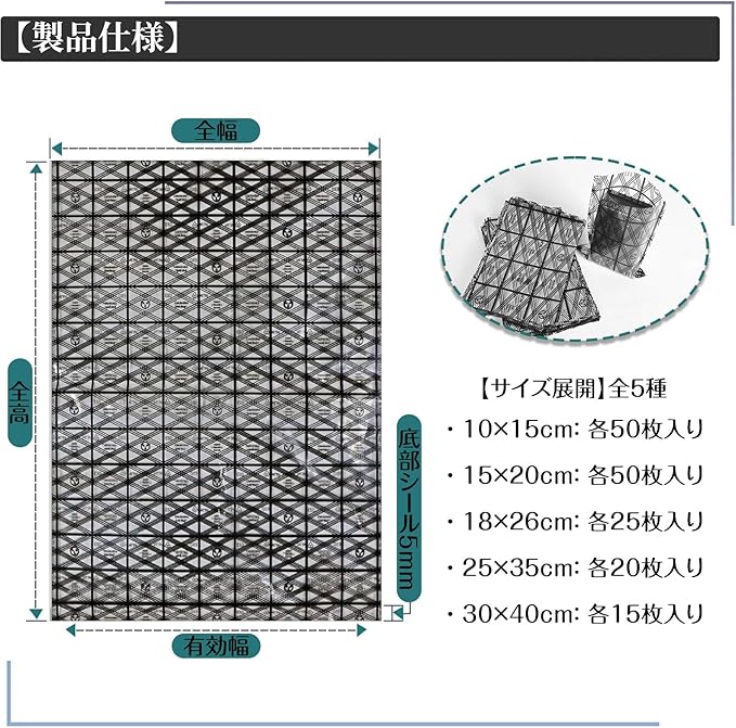 【セット内容】 5サイズから選択可能:10 15cm(50枚)、15 20cm(50枚)、18 26cm(25枚)、25 35cm(20枚)、30 40cm(15枚)。様々な大きさの電子部品に合わせてお選びいただけます。