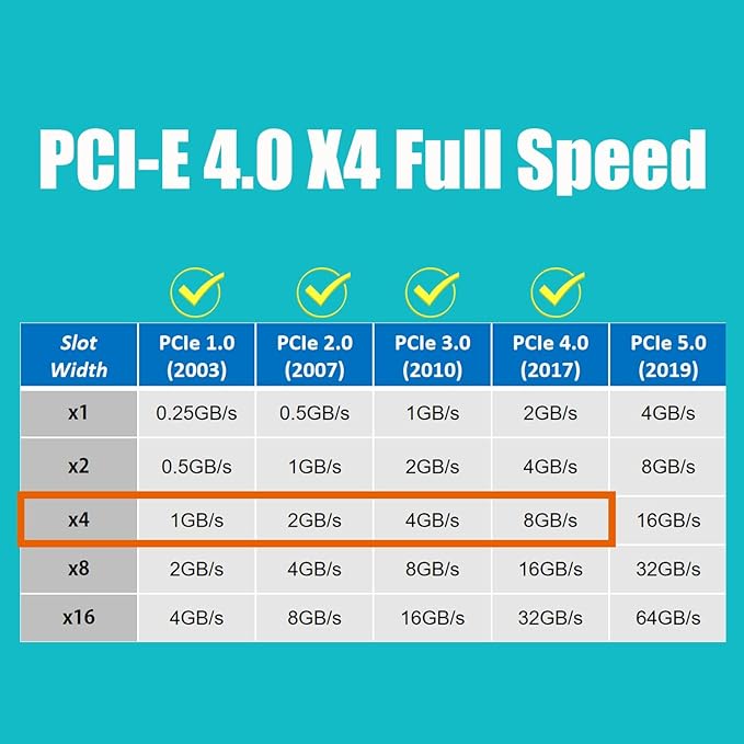 PCIe 4.0 X4(64Gbps)のフルスピードに着くためには、CPUとマザーボードのPCIeスロット、PCIe M.2 SSDがすべてPCIe 4.0に対応している必要があります。 (注:第11世代以下のインテルCPUではPCIe 4.0はサポートされていません。)