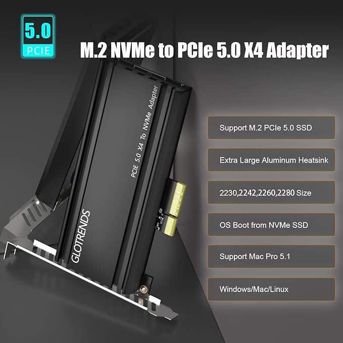 GLOTRENDS PA18 M.2 NVMe - PCIe 5.0 X4アダプタ、M.2 NVMe SSD用、特大アルミニウムヒートシンク、レギュラー/ロープロファイルブラケット (ブラック)