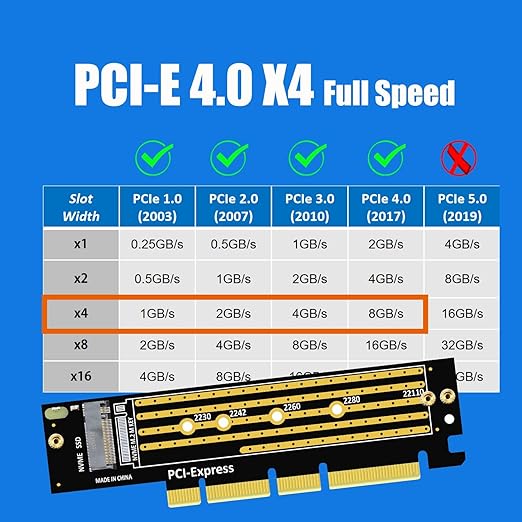 PCIe 4.0 X4(64Gbps)のフルスピードを実現するには、CPU、マザーボードのPCIeスロット、PCIe M.2 SSDのすべてがPCIe 4.0をサポートしている必要があります(注:PCIe 4.0は第11世代以下のIntel CPUではサポートされていません)。
