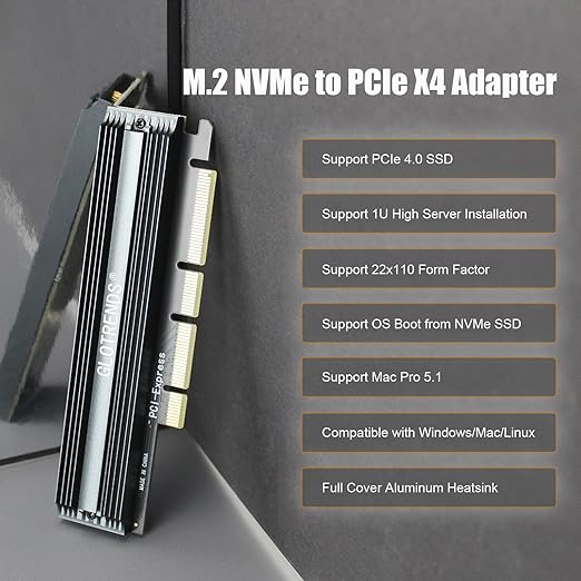 GLOTRENDS PA16 22110/2280 M.2 NVMe-PCIe4.0X4アダプタ、フルカバーアルミヒートシンク付き、PC/1Uサーバ設置用